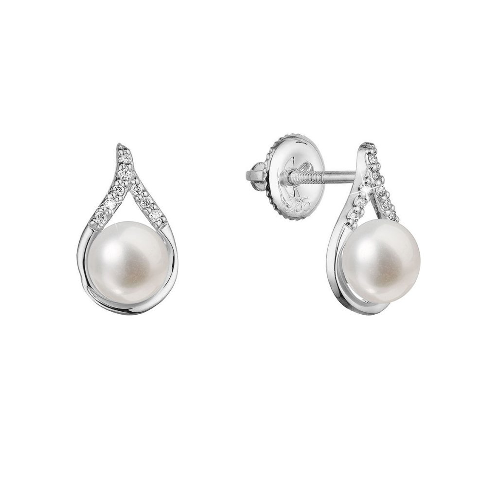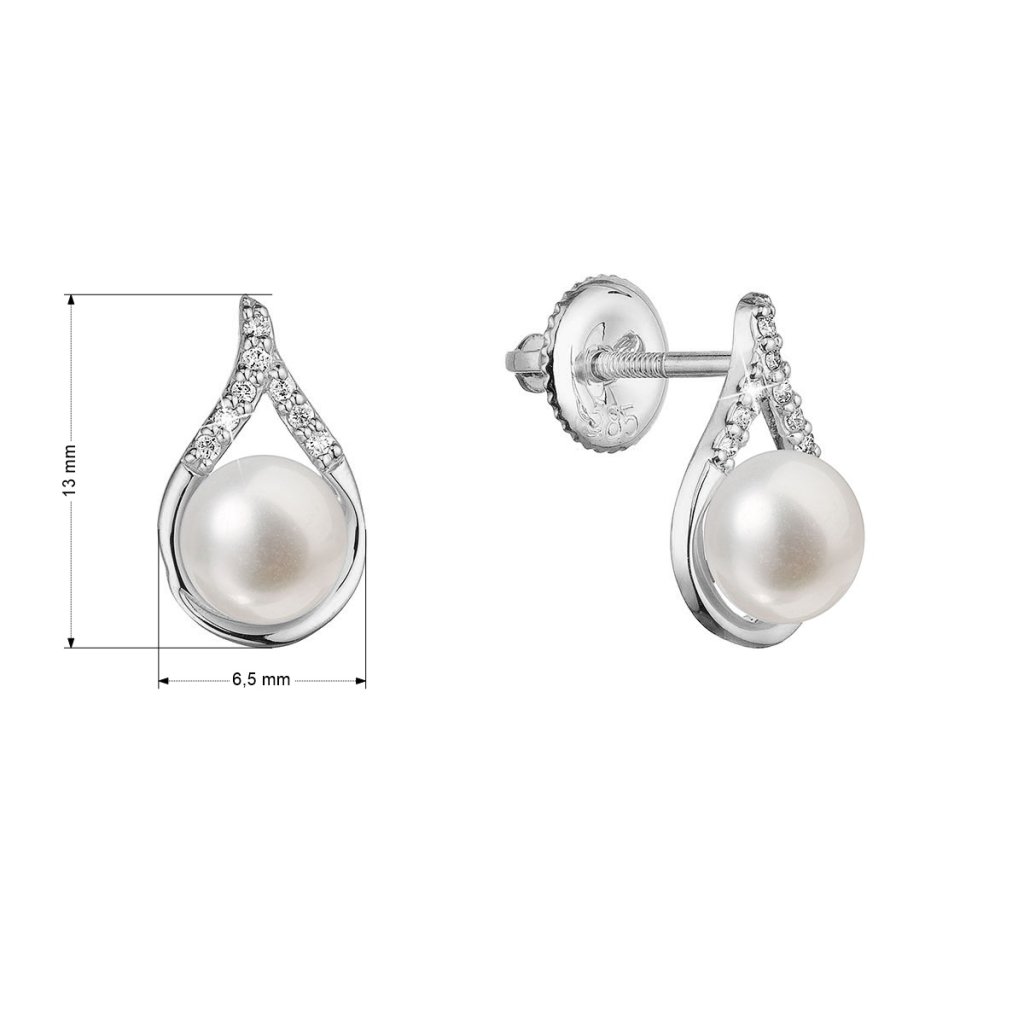 Zlaté 14 karátové náušnice slza biele zlato s riečnou perlou a briliantmi 81PB00037