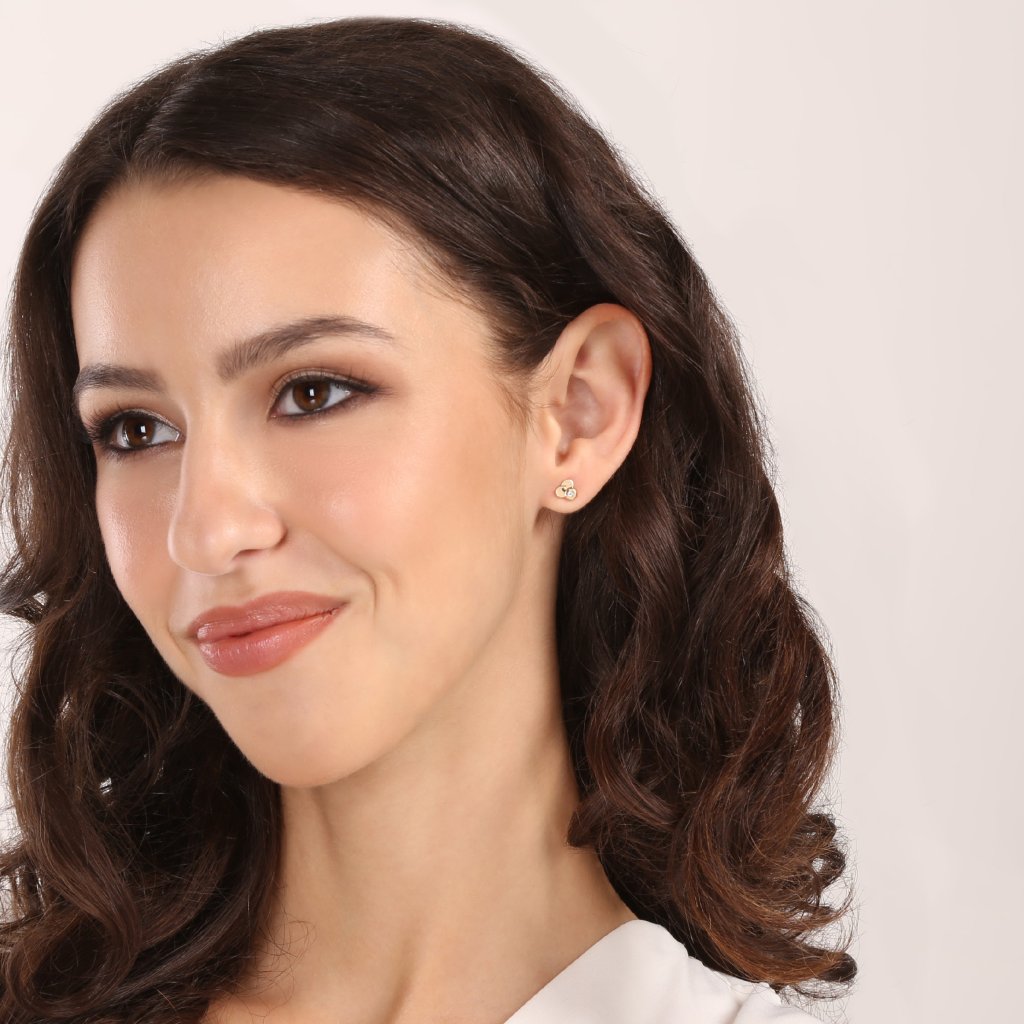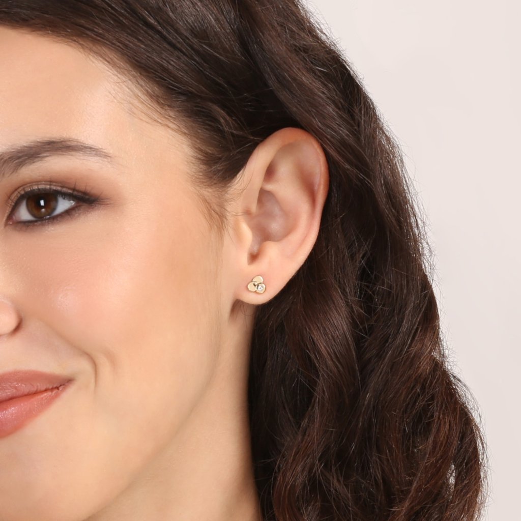 Drobné zlaté náušnice v tvare trojlístkov symbolizujú šťastie a harmóniu, zatiaľ čo čistý dizajn podčiarkuje modernú minimalistickú eleganciu.