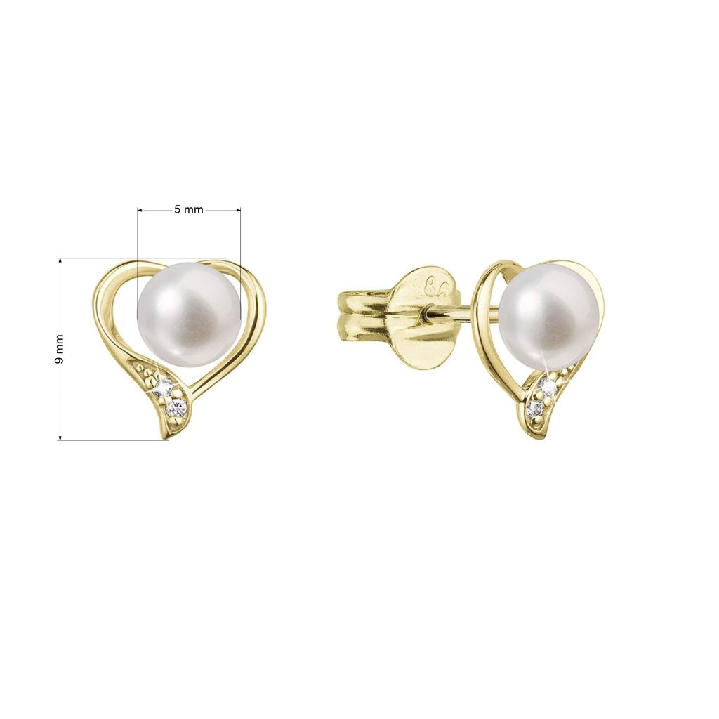 Na náušnice 91PB00054 bolo použité 14 karátové žlté zlato s rýdzosťou 585/1000 a pravé kultivované sladkovodné riečne perly s briliantmi. Perly s priemerom 5 mm sa môžu pochváliť najvyššou kvalitou AAA . Tvar zlatého srdiečka je zdobený nestarnúcimi briliantmi. Celkom 4 brilianty o 0,020 ct.