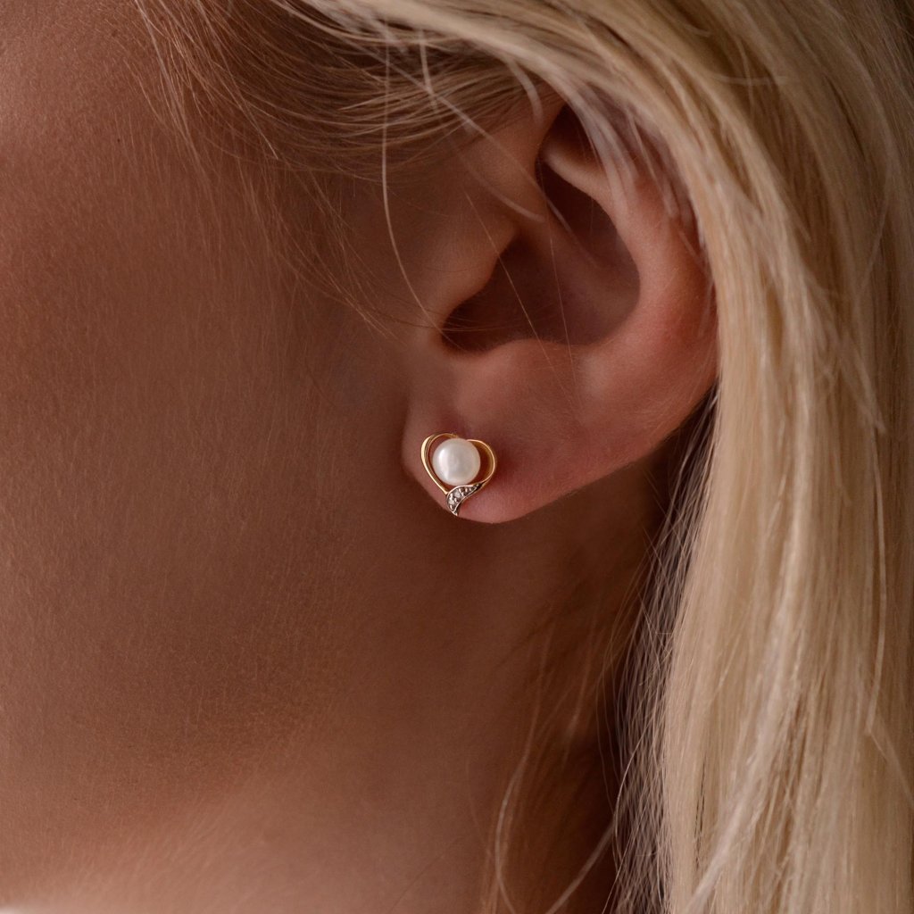 Nežné náušnice s bielou riečnou perlou posadenou do zlatého srdiečka s briliantmi sú nádherným šperkom z lásky.