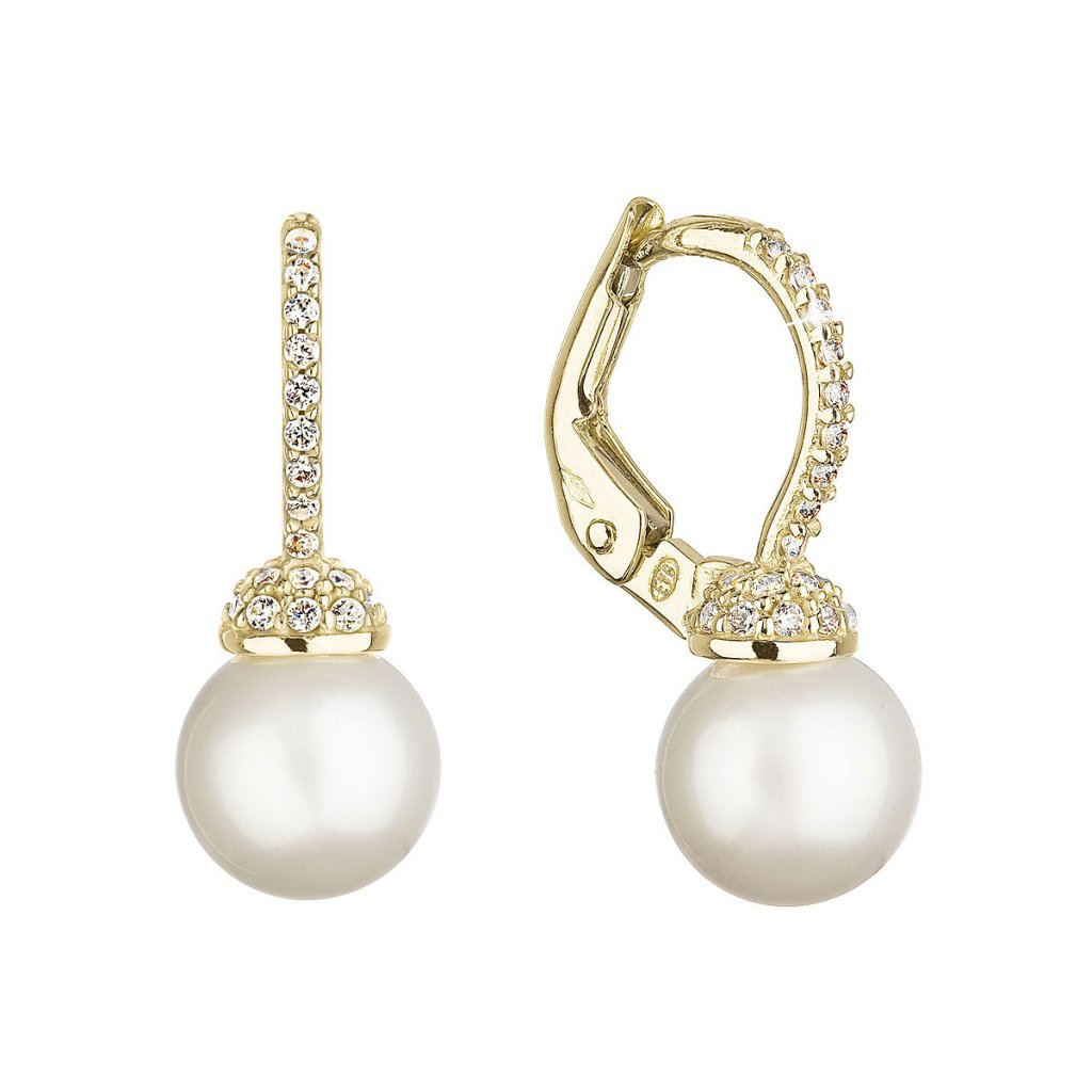 Náušnice 91PZ00022 sú vyrobené zo 14 karátového žltého zlata s rýdzosťou 585/1000 a zdobia ich okrúhle biele riečne perly tej najvyššej kvality AAA . Šírka perličky je 7,5-8 mm. Náušnice navyše zdobia nad sebou vsadené zirkóny, ktoré svojim ligotom umocňujú krásu. Náušnice majú zapínanie na klapku.