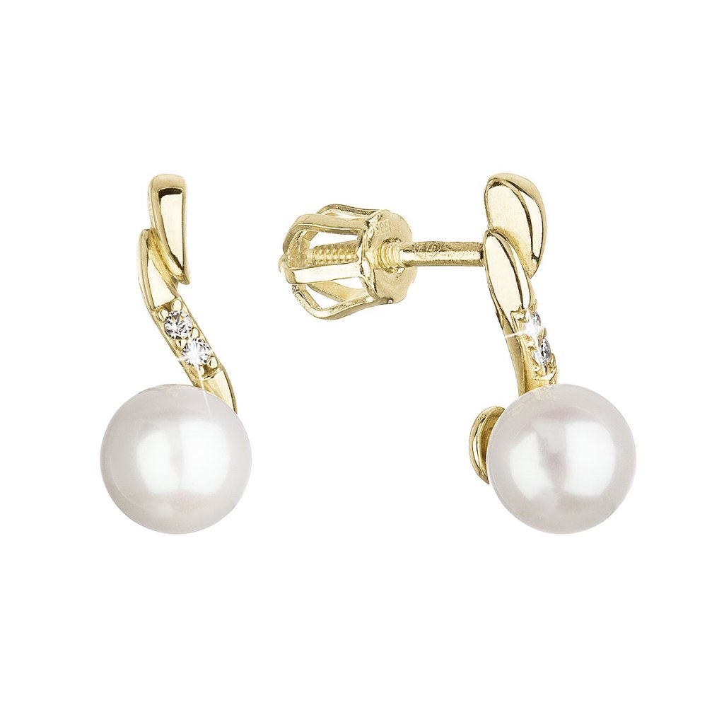 Zlaté 14 karátové náušnice žlté zlato s bielou riečnou perlou a zirkónmi 91PZ00027