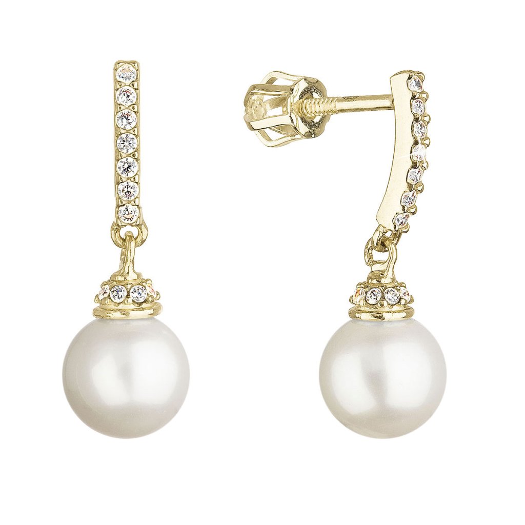 Zlaté 14 karátové náušnice žlté zlato s visiacou bielou riečnou perlou a zirkónmi 91PZ00021