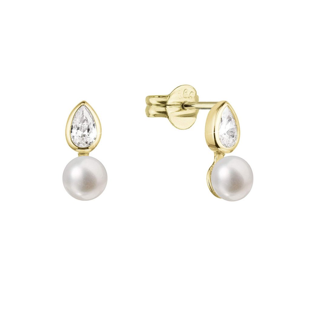 Zlaté 14 karátové náušnice zo žltého zlata s bielou riečnou perlou a zirkónmi 91PZ00053