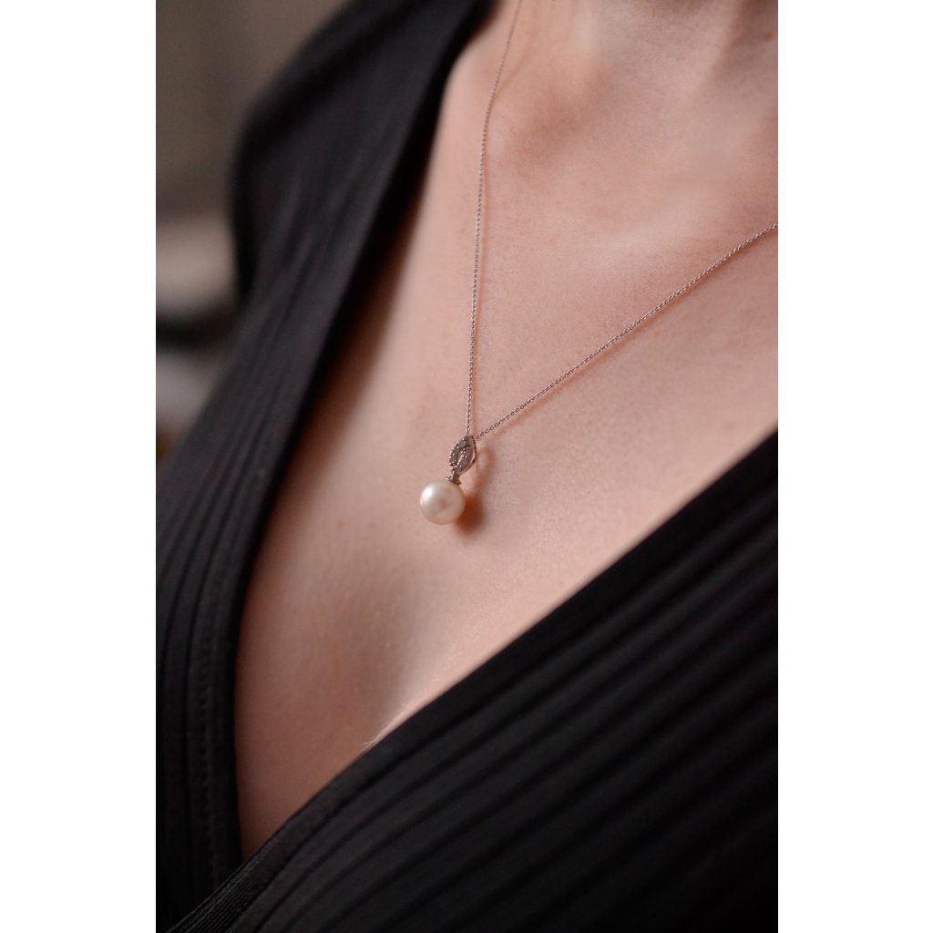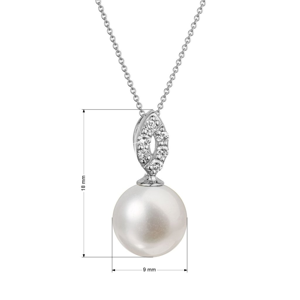 Zlatý náhrdelník bohato vysadený briliantmi nad lesklou bielou riečnou perlou je elegantný a nadčasový.Na náhrdelník 82PB00040 bolo použité 14 karátové biele zlato s rýdzosťou 585/1000 a pravá kultivovaná sladkovodná riečna perla s mnohými briliantmi. Perla s priemerom 9 mm je vysokej kvality AAA . Šperk zdobí 6 briliantov o 0,090 ct.