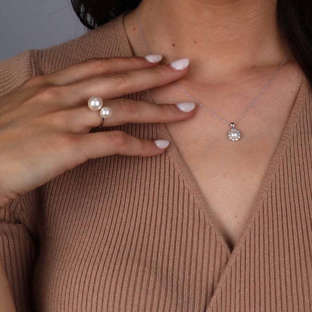 Uprostred tohto kvetinkou inšpirovaného náhrdelníka sa nachádza biela pravá riečna perla , ktorá pridáva do dizajnu jedinečný a prirodzený prvok. Okolo nej sú elegantne rozmiestnené brilianty , ktoré jemne iskria a dotvárajú celkový dojem nádherného lesku.Náhrdelník 82PB00036 v tvare kvety je vyrobený zo 14 karátového bieleho zlata s rýdzosťou 585/1000. Uprostred je pravá riečna perla bielej farby a okvetné lístočky tvoria malé brilianty . Perla s priemerom 6 mm je vysokej kvality AAA . Briliantových okvetných lístočkov je 10 o 0,090 ct.