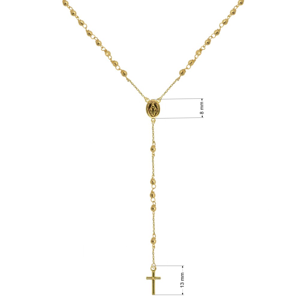 Zlatý náhrdelník ruženec s krížom a medailónkom Panny Márie , zdobený zlatými korálkami, je nádherným a symbolickým šperkom spájajúcim náboženskú tradíciu s eleganciou . Tento výnimočný náhrdelník vyžaruje pokoj a poskytuje priestor na osobné zbožštenie.