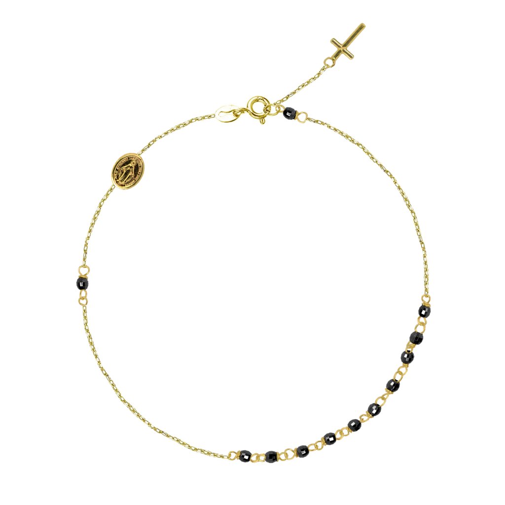 Symbolický moderný náramok s krížikom pripomína kresťanskú vieru a modlitbu, zatiaľ čo medailónik s obrazom Panny Márie dodáva náramku duchovný rozmer. Čierne korálky poskytujú kontrast a eleganciu pre tieto náboženské symboly.Náramok je vyrobený zo žltého 14 karátového zlata a má po obvode malé čierne fazetované korálky .