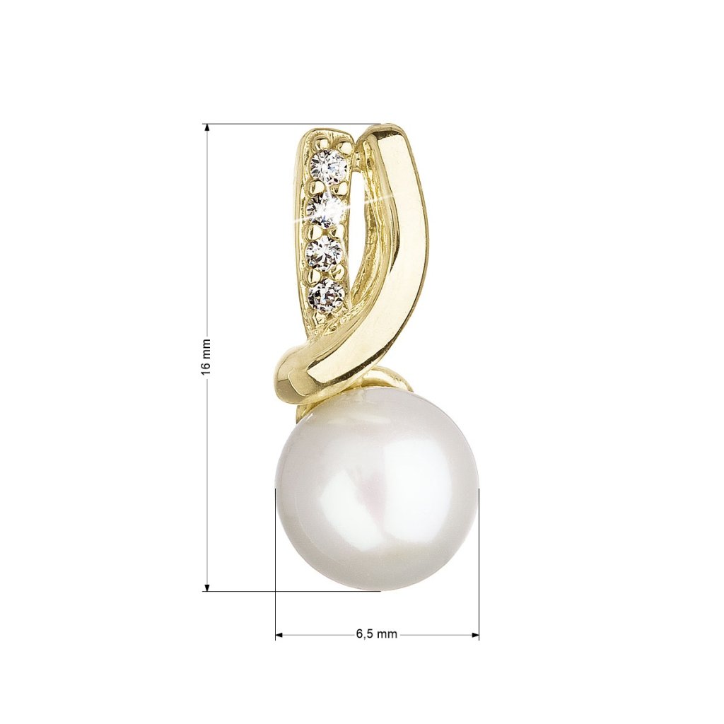 Prívesok 94PZ00006 je vyrobený zo 14 karátového žltého zlata s rýdzosťou 585/1000 a zdobí ho okrúhla biela riečna perla tej najvyššej kvality AAA . Šírka perličky je 6,5-7 mm. Navyše sa krásne trblietajú vsadené zirkóny.
