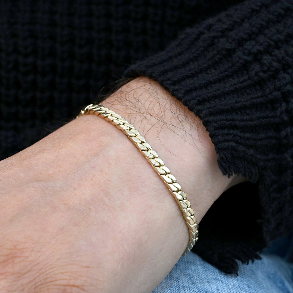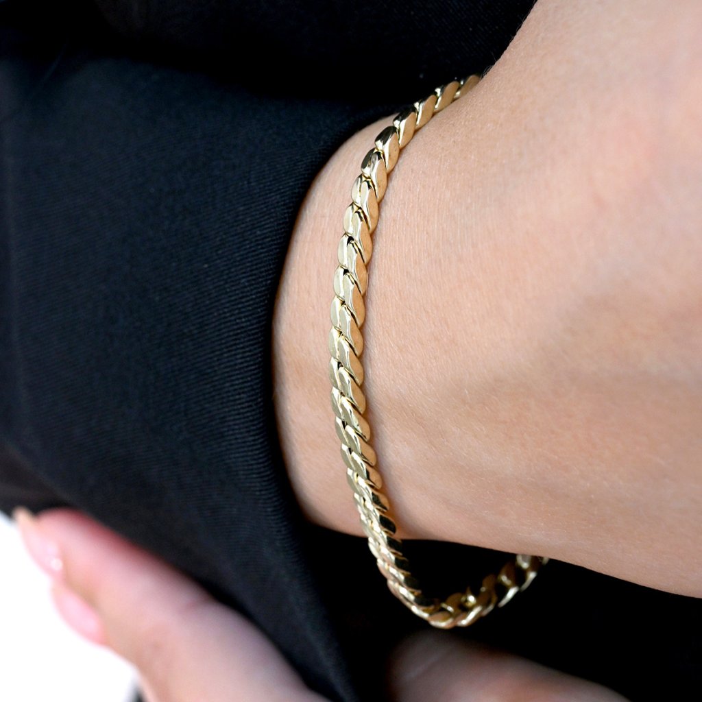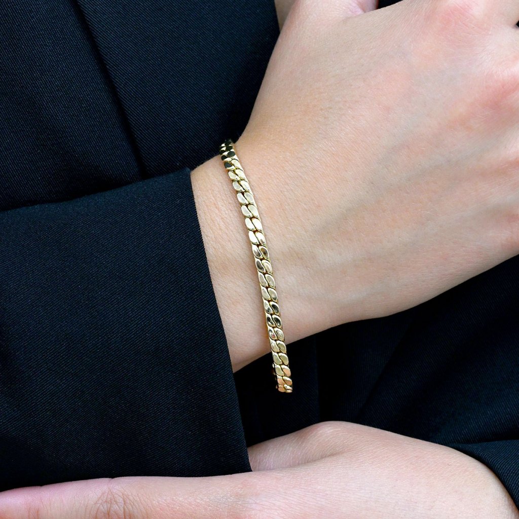 Jeho precízne brúsené a jemne zaoblené články vytvárajú harmonickú líniu, ktorá sa krásne leskne pri každom pohybe. Náramok pôsobí pevne, luxusne a zároveň dokonale ladí s moderným aj tradičným štýlom.